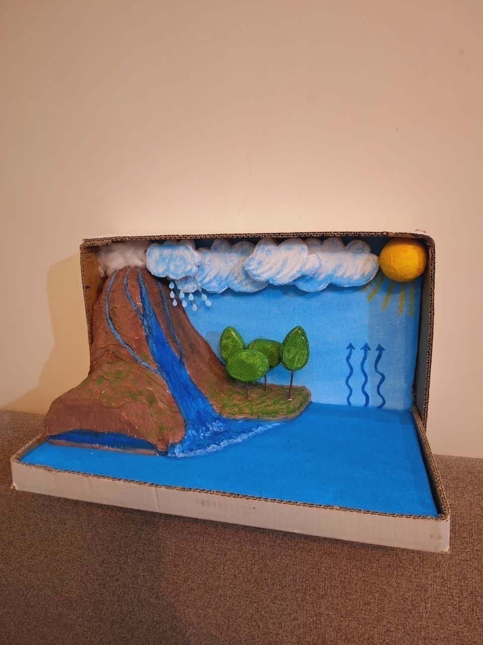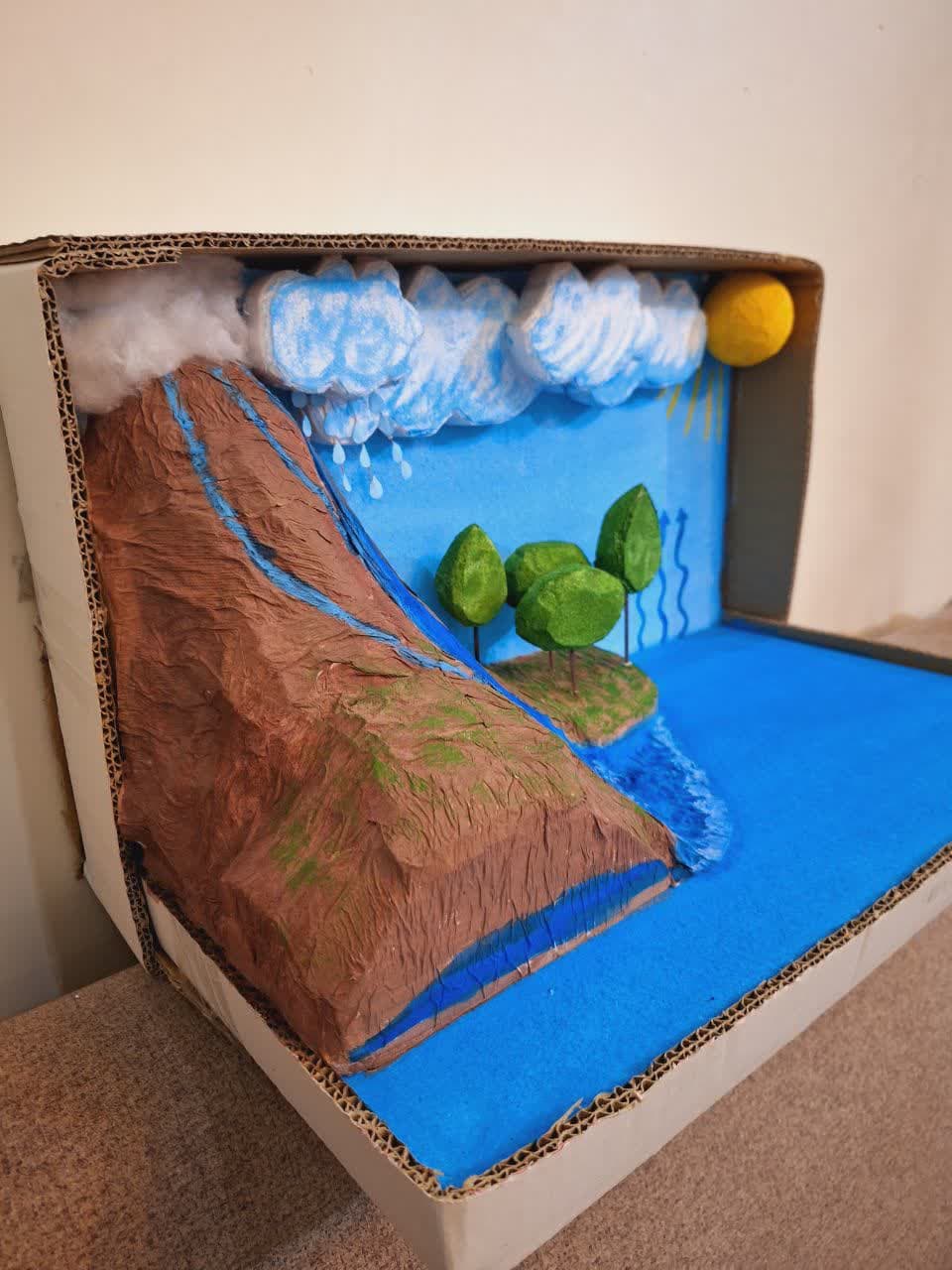 زمینه ماکت از کارتن فشرده ساخته شده که مقاومت و ایستایی بالایی دارد. اجزای برجسته مانند کوه، ابر، باران و رودخانه از یونولیت فرم‌دهی‌شده تهیه شده‌اند تا تصویرسازی واقعی‌تری از فرآیندهای طبیعی ایجاد کنند.