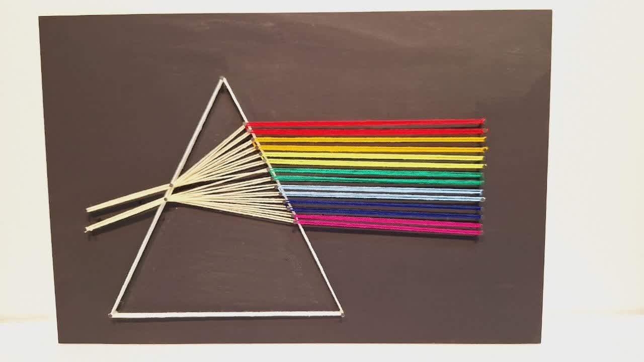 منشور با استفاده از نخ‌های کاموایی رنگی و میخ‌ها شبیه‌سازی شده تا مسیر ورود نور سفید و تبدیل آن به طیف رنگ‌ها به شکلی ساده و قابل فهم برای دانش‌آموزان به نمایش گذاشته شود.