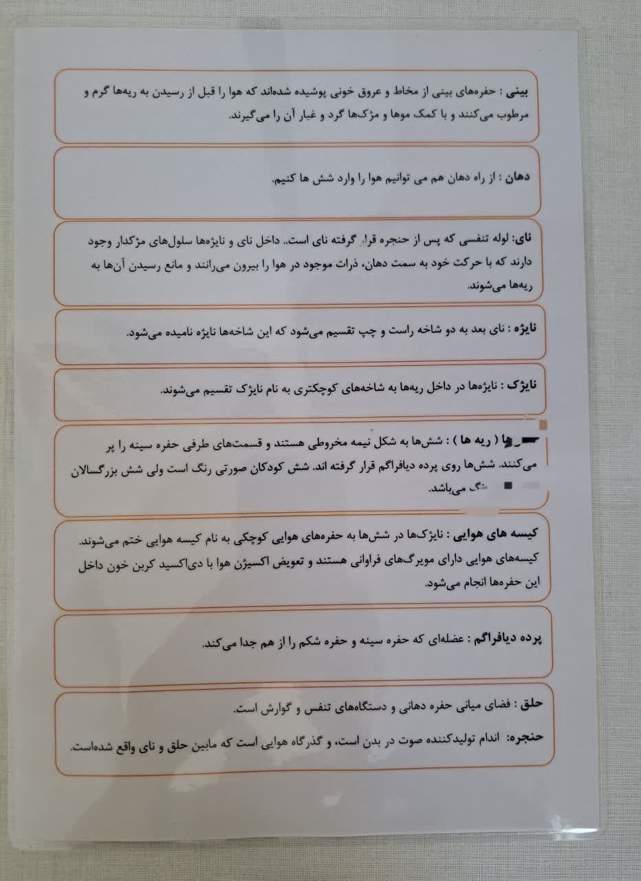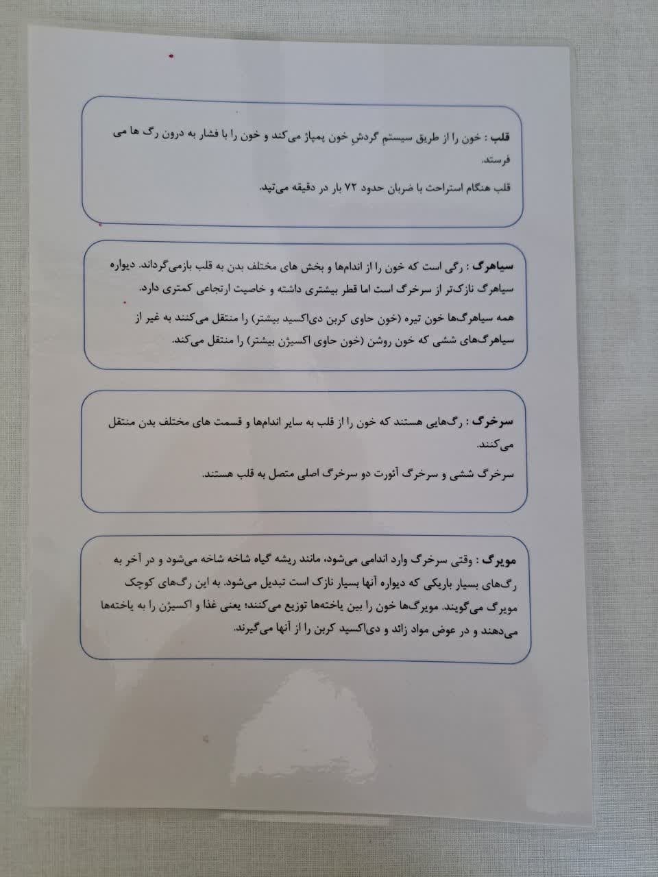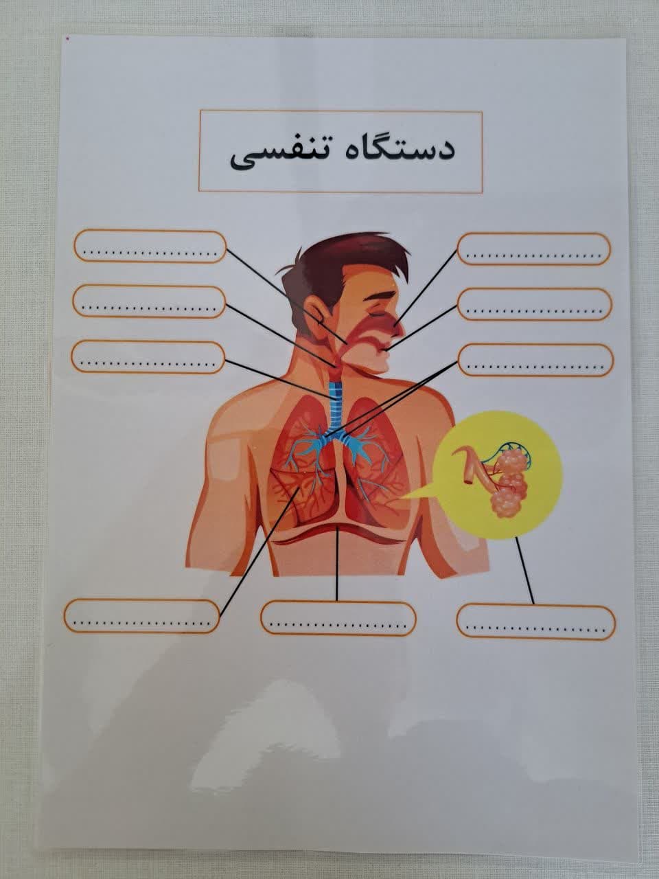 در یک سمت برگه، اجزای هر سیستم به شکل تصویری مشخص شده و سوالاتی برای شناسایی بخش‌ها مطرح شده است؛ در سمت دیگر، توضیحات علمی و کاربردی درباره همان اجزا ارائه شده است.