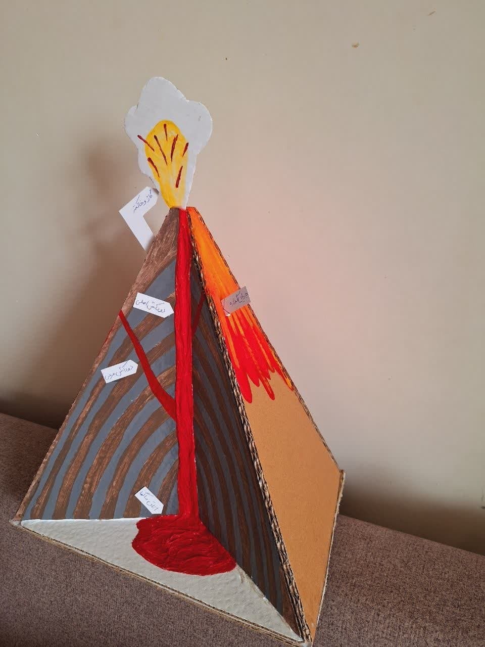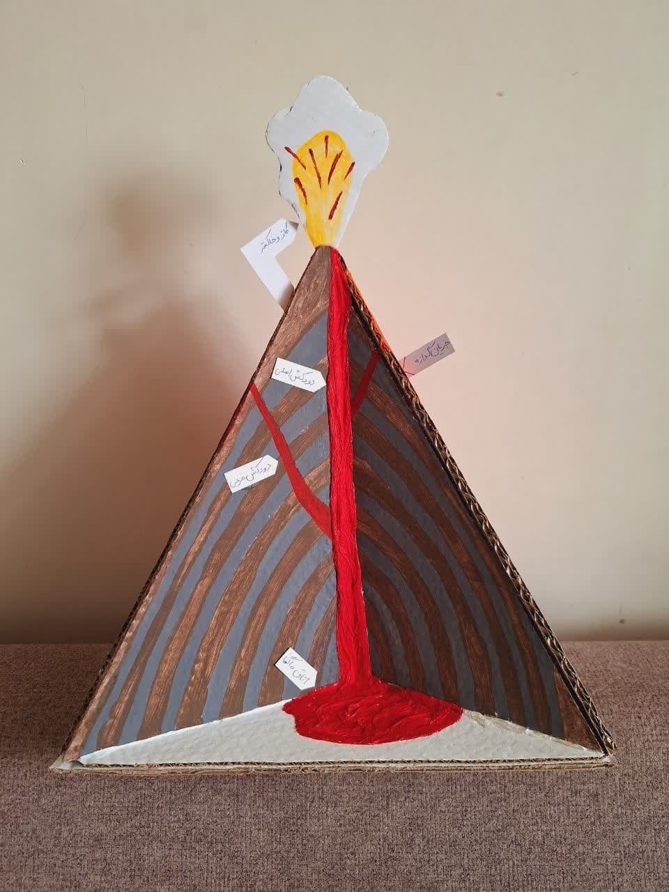این ماکت آموزشی، نمایی سهبعدی و ساده از ساختار کوه آتشفشان را برای دانشآموزان پایه ششم ابتدایی ارائه میدهد. طراحی آن به گونهای است که مفاهیم مربوط به آتشفشان، مانند دهانه، مجرای اصلی، مخروط آتشفشانی و جریان گدازه بهصورت واضح و قابل درک نمایش داده میشوند.